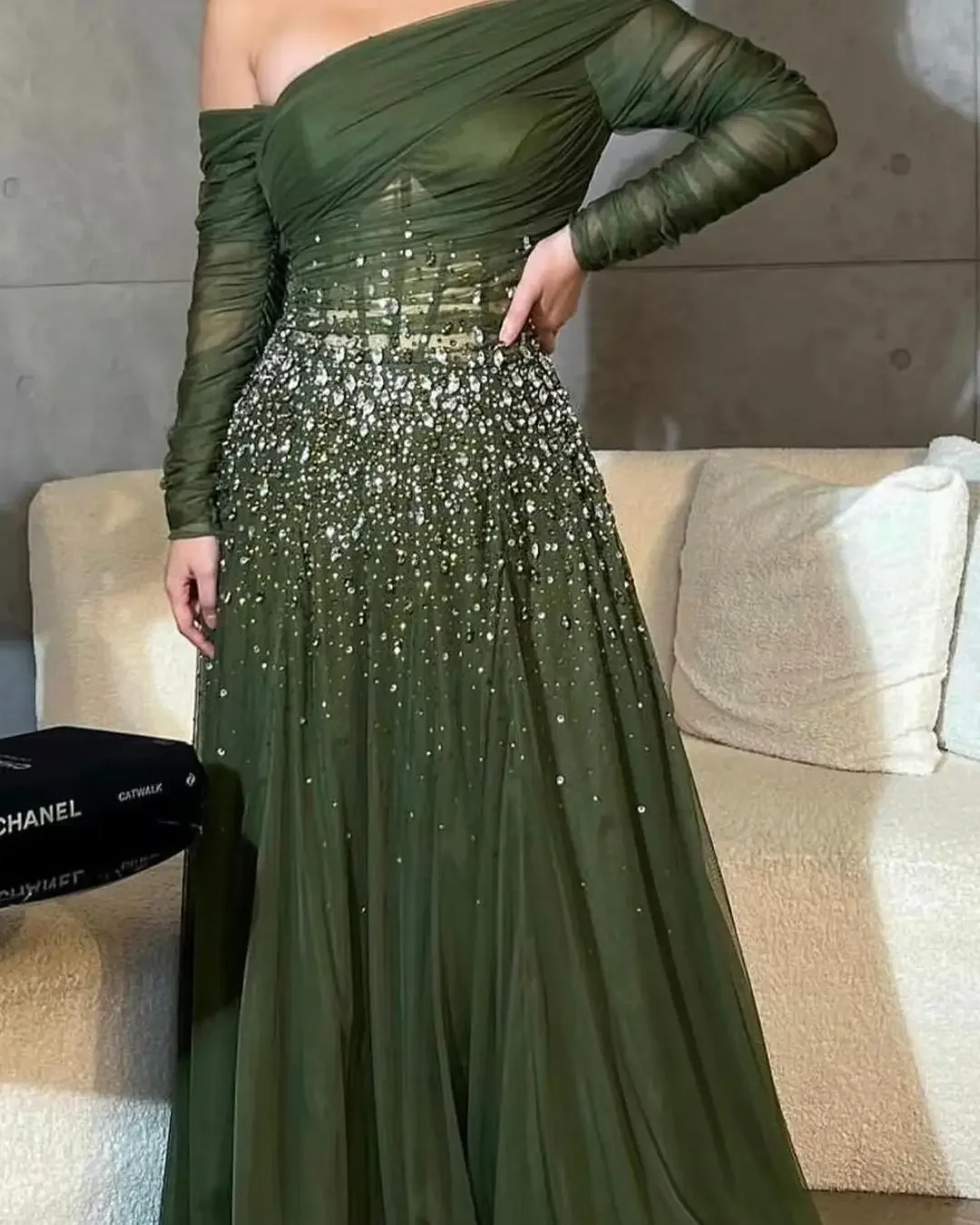 Customized Off The Shoulder Long Sleeves Prom Dresses Beadings Sequins Tulle A-line Floor Length Formal Party Dresses