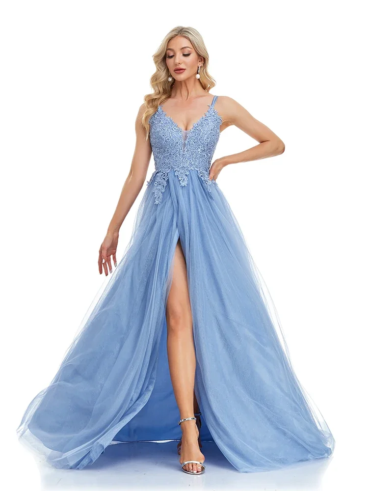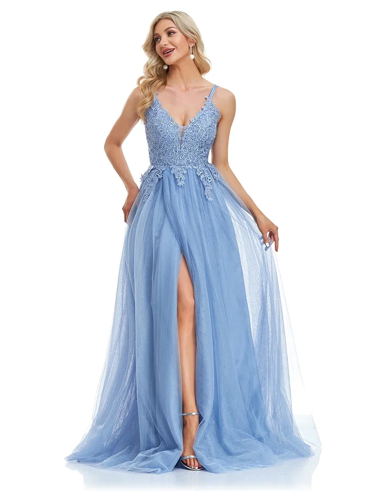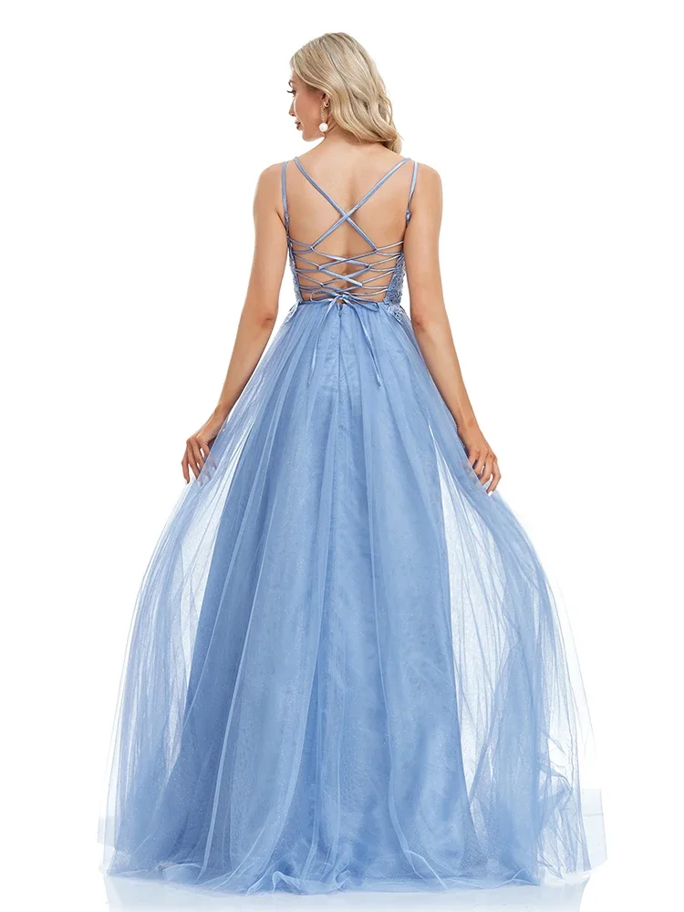 Luxury Tulle Fine Embroidery Evening Dress 2025 Women Deep V-neck Aline Prom Wedding Party Floor Length Blue Gown