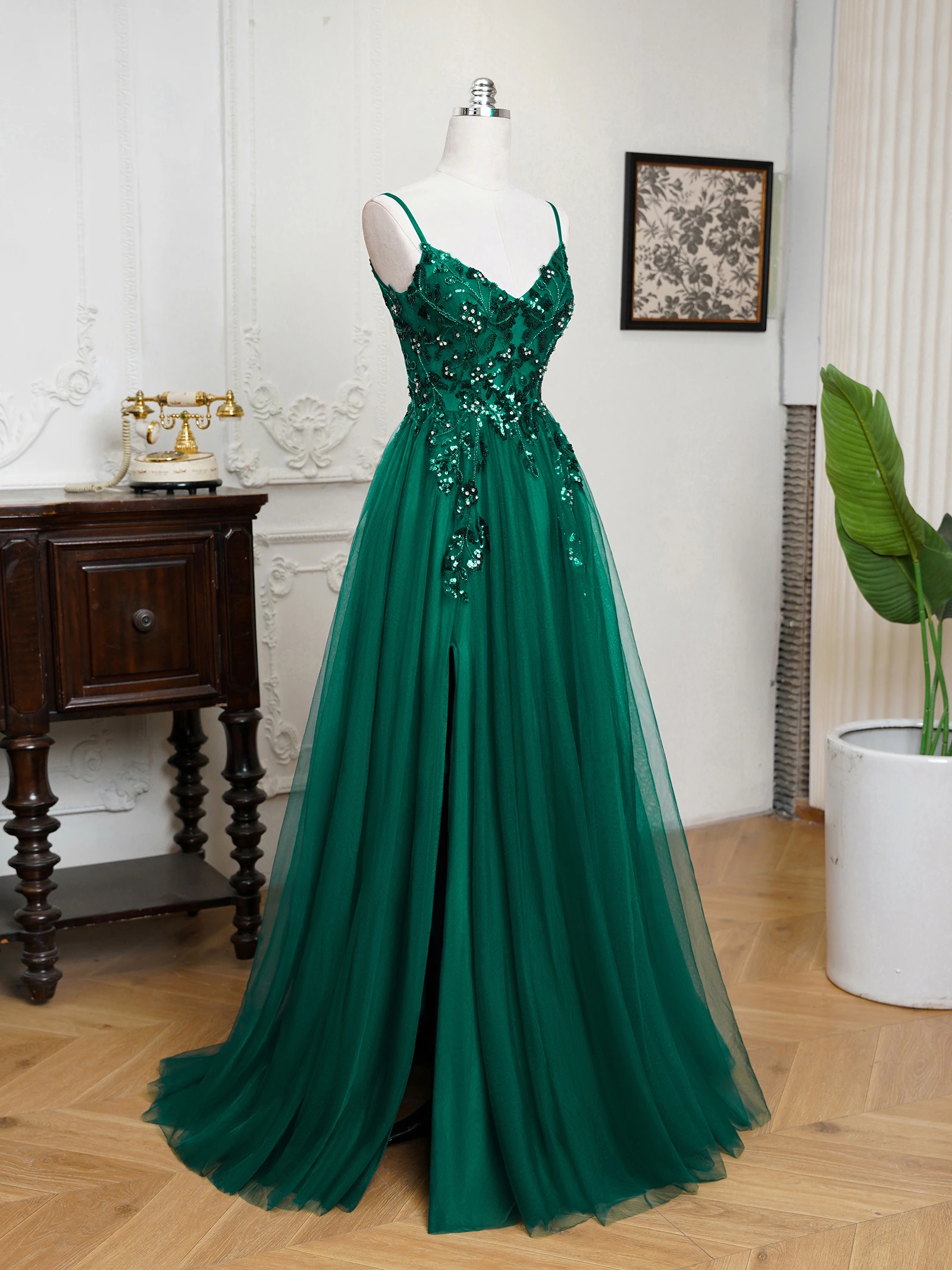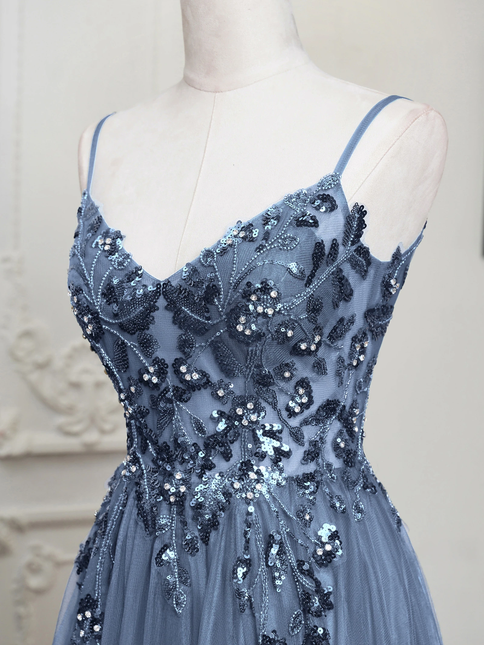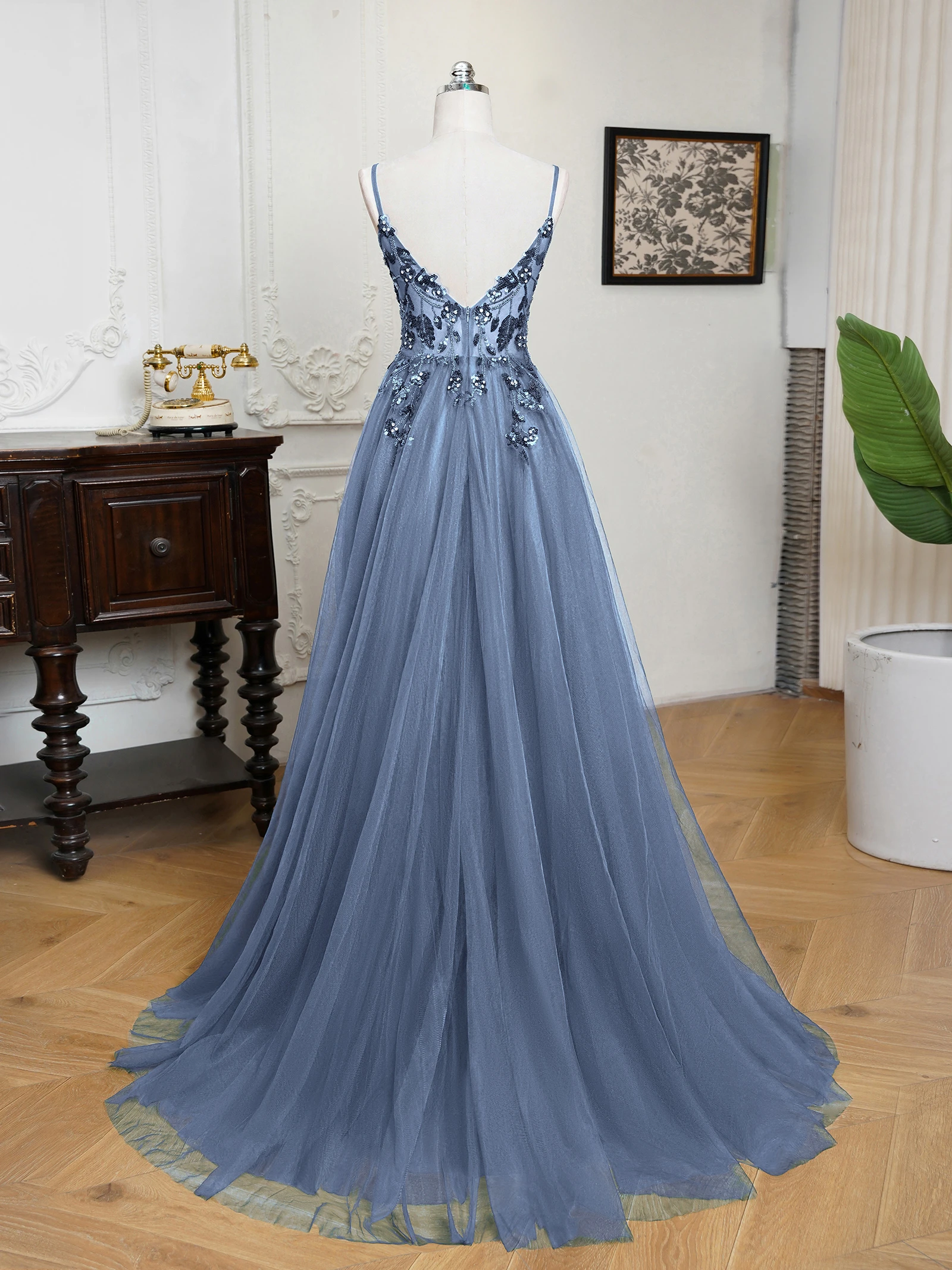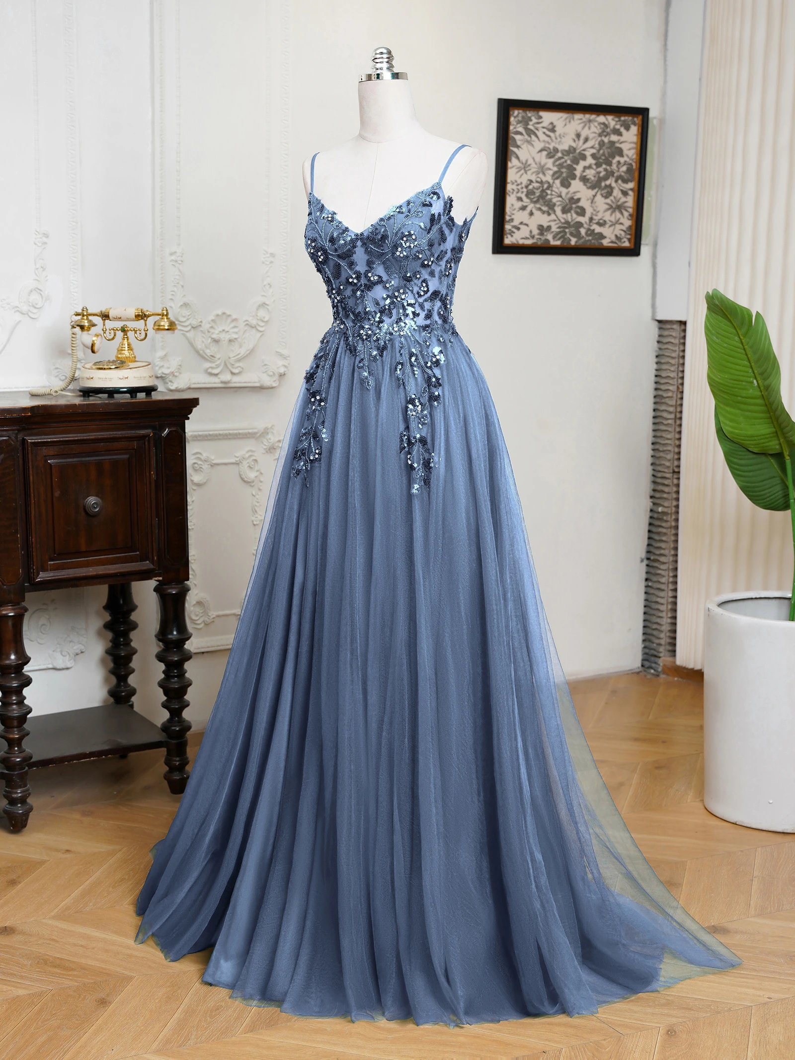 Sexy Maxi Train Evening Dresses Spaghetti Straps V-Neck Sequin Appliques Backless Prom Dress Tulle A-Line High Split Sling Gowns